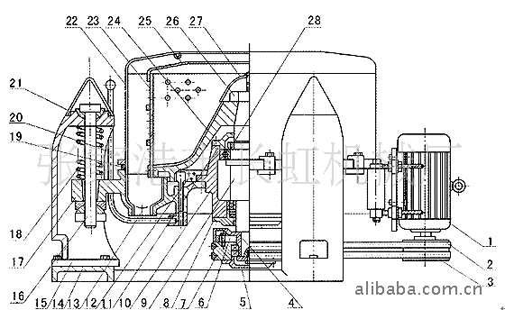 電動(dòng)機(jī)通過(guò)離合器帶動(dòng)鼓高速旋轉(zhuǎn),物料由上部加入轉(zhuǎn)鼓,在離心力作用下趨向鼓壁,